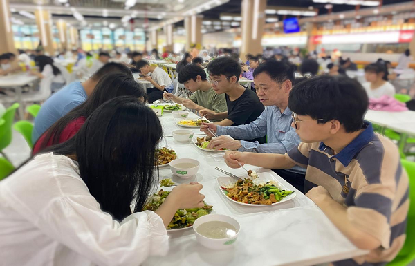 中午时分,张晨曙校长走进新食堂二楼,和同学们一起排队用餐。“食堂的饭菜合口味吗?你们觉得价格怎么样?”张晨曙校长在餐桌上同大家拉开家常,详细了解学生对食堂菜品种类、价格、口味等情况,并对学生们在学习、生活等方面提出合理化建议和意见。“张校长很热情、亲切、和蔼,并在百忙中抽空来看望我们,我们心里感到无比的温暖。张校长还帮我们夹菜,就像父辈在家里一样关心关爱我们,希望下次还能在食堂偶遇他。”学生彭当开心地说。