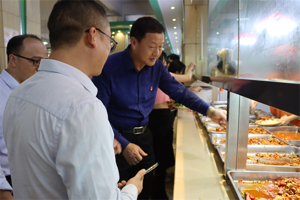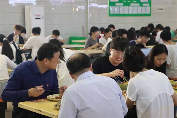 中午12时15分,胡涌书记来到中心食堂,与同学们一起共进午餐,亲切交流。胡涌书记向同学们详细询问了一个月花费多少生活费,食堂菜价、饭菜口味、卫生服务等情况。亲切入微的交谈,让在座的每一位同学都倍感温暖,就餐气氛轻松愉悦。就餐中,胡涌书记和同学们共同践行了“光盘行动”,鼓励更多师生身体力行。
