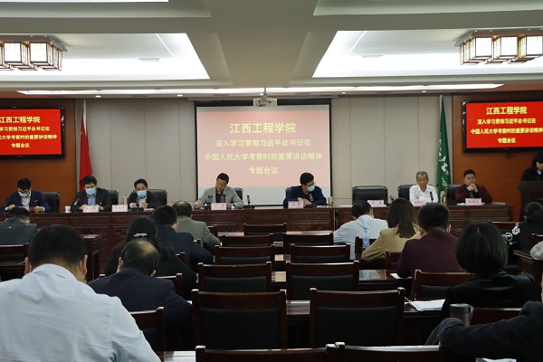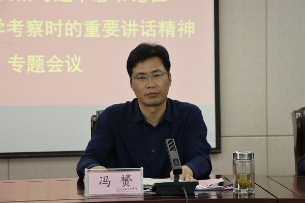 党委副书记冯赟传达学习习近平总书记在中国人民大学考察时的重要讲话精神;冯赟认为,要以总书记重要讲话精神为指引,做好三方面工作。一是以“大思政”理念培养人才。以马克思主义理想信念为引领,把思政课提升到一个新高度;要有效推进课程思政与思政课程同向同行,引导学生用专业基础理论、方法技术分析问题、解决问题,建立对国家民族的正确认知;要继承红色基因,发扬革命传统,弘扬传统文化,坚定文化自信和民族自信。二是加强教师队伍建设,教育引导教师做中国道路的坚定实践者,在新时代构建中国特色的哲学社会科学,回答好中国之问、世界之问、人民之问、时代之问,做学生的引路人。三是要结合巡视整改,狠抓贯彻落实,务求实效,把学习宣传贯彻总书记重要讲话精神落到实处。