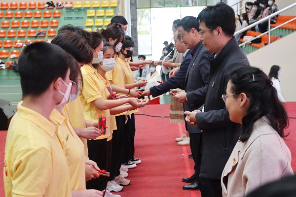 随后,由各位领导为新团员代表颁发团章、团员证和团徽。大家纷纷表示,“从佩戴上团徽的那一刻起,就明白这不仅仅只是一枚小小的团徽,它们代表着中国共产主义青年团,它们象征着新一代的青年学生朝着党所指引的方向奋勇前进。更重要的是多了一份责任与使命,新时代、新征程、新目标、新使命,大家会高举旗帜跟党走,肩负时代历史使命,以实现中华民族伟大复兴为己任,把个人理想融入民族复兴伟大理想和中国特色社会主义思想,担负起时代赋予的光荣使命,奏响新时代的青春之歌。”