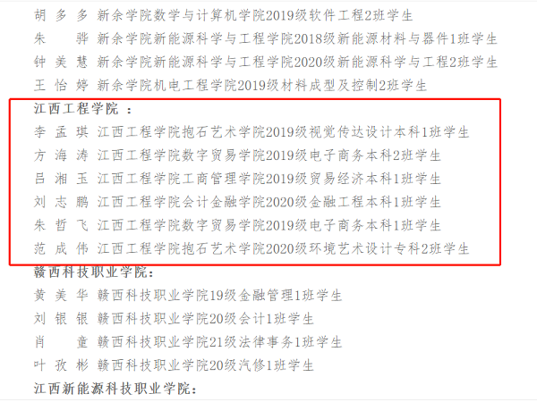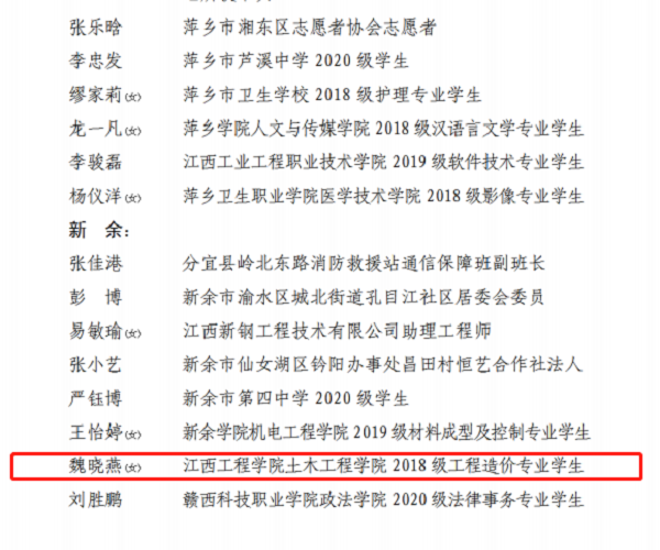 为表彰先进、树立典型,激励全省各级团组织和广大团员、团干部锐意进取、奋发有为,共青团江西省委印发了《关于表彰全省五四红旗团委(团支部)、全省优秀共青团员、全省优秀共青团干部的决定》。其中,我校土木工程学院18级工程造价专业魏晓燕荣获“全省优秀共青团员”称号。