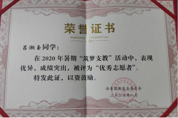 曾担任院学术部部长、演讲协会网宣部部长,现担任班级团支书兼组织委员。她策划开展了多项学院特色活动,认真、负责地做好各项工作,尽职尽责,得到老师、同学们的一致好评,期间带领分院、班级荣获了许多荣誉。她也乐于参加各种公益活动和志愿活动,累计志愿服务时长453个小时,曾在暑期同来自全国各地的12位大学生志愿者组成支教队,远赴湖南进行支教,教授贫困家庭孩子以及留守儿童,相关报道及视频在多个主流媒体上发布。她也曾作为优秀志愿者代表,在学校暑期三下乡出征仪式上发言,并担任21年暑期三下乡工管院服务队队长,组队下乡开展志愿活动,带领分院成员以志愿者的形式深入基层开展志愿服务。
