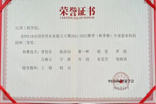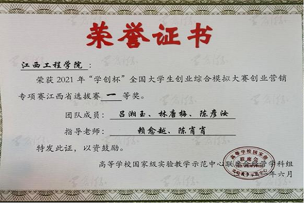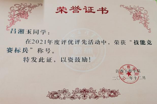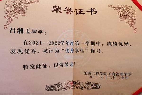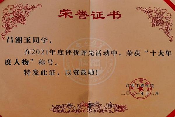 她先后获得优秀学生干部、优秀共青团干部、优秀学生、工作积极分子、衡东县优秀志愿者、阅读达人、技能竞赛标兵、华亿平台十大年度人物等称号。在校期间,成绩排名保持专业前三,积极参与校内外学科竞赛并取得了不错的成绩,荣获学创杯大学生创业综合模拟大赛江西省一等奖、信息技术大赛江西省一等奖、POCIB全国外贸从业能力大赛团体二等奖及个人三等奖、亿学杯全国大学生英语词汇及综合能力大赛省一等奖等多个奖项。