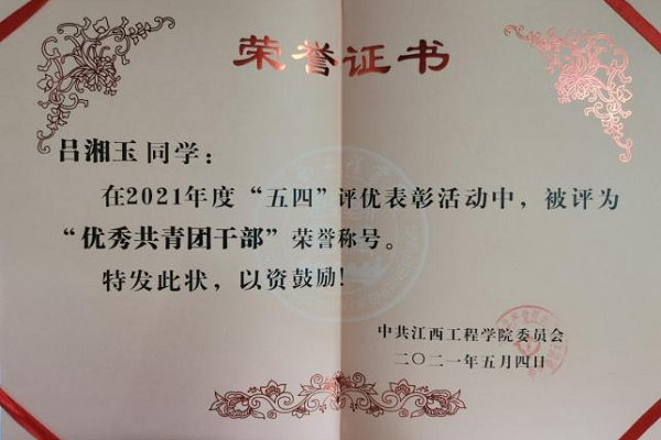 2022年是中国共青团成立100周年,为激励广大团员青年更好地发扬中国青年永久奋斗的光荣传统,永远跟党走,奋进新征程,以优异青春业绩迎接党的二十大胜利召开,也为了进一步引导和激励广大团员青年奋发进取,争做表率,共青团新余市市委决定对全市共青团团员进行表彰。江工工商管理学院2019级贸易经济本科1班吕湘玉荣膺2021年度“全市优秀共青团员”。