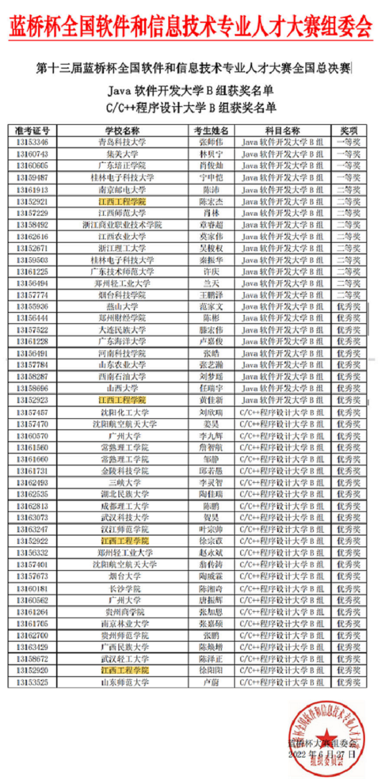 2022年6月18日,第十三届“蓝桥杯”全国软件和信息技术人才大赛迎来全国总决赛。历经初赛、省赛等层层选拔,我校4名学子晋级全国总决赛,最终荣获国家级Java软件开发二等奖1项(陈宏杰)、优秀奖3项(徐阳阳、徐宗苡、黄佳新)的好成绩,获奖层次和数量居我省同类参赛高校前列。