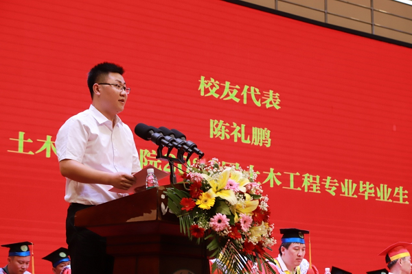 在毕业典礼上,陈礼鹏寄语学弟学妹,并用三句话与同学们共勉。第一句是“昂首起步,埋头探路”。“昂首起步”就是学弟学妹们从入学开始,就要有饱满的精神状态,对学习充满激情,对前途充满憧憬,对未来充满信心;第二句是“恒心永久,战胜困苦”,在确定奋斗目标和理想之后,在学习的过程中要保持良好的心态和刻苦的精神;第三句是“修身养性,无私奉献”,做人做事放在第一位的就是崇德修身。道德品质是人生中最重要的基石,其中首要的是具有团结协作和奉献精神,其次就是要着力加强自身修养。