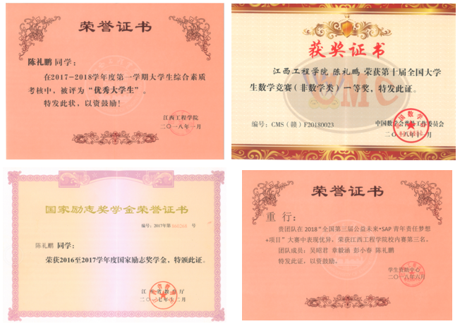 据土木工程学院老师们介绍,2016年陈礼鹏进校时,成绩并没有优势,但他在江工求学几年间,刻苦学习,虚心求教,在校期间,他担任过书法社社长,获得全国数学竞赛江西赛区一等奖;校简历设计大赛一等奖; 校优秀大学生; 校优秀共青团干部; SAP大赛三等奖;2016至2017学年度、2017至2018学年度获得国家励志奖学金。