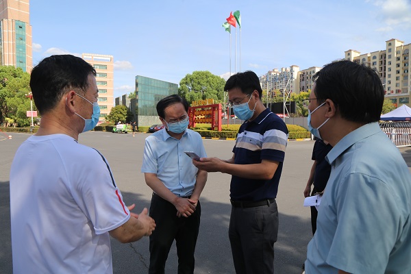 (本网讯 何凯 报道)8月25日,市教育局党委书记、局长曾先锋,市教育局党委委员、副局长刘焦华一行冒着酷暑莅临我校督查开学疫情防控准备工作。校党委副书记、校长张晨曙,党委副书记、副校长冯赟,党委委员、校长助理邹建民陪同。
