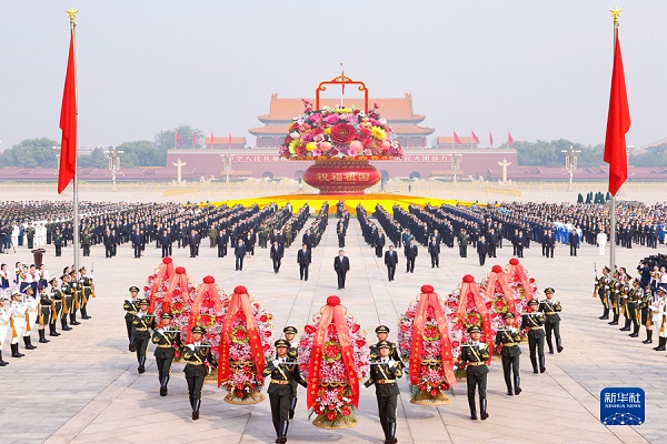 10时整,向人民英雄敬献花篮仪式开始。军乐团奏响《义勇军进行曲》,全场齐声高唱中华人民共和国国歌。