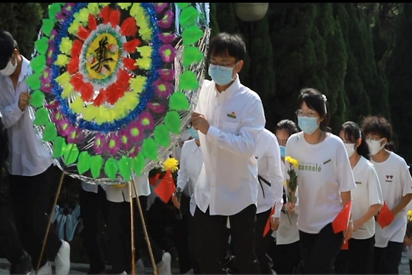 默哀毕,在深情的《献花曲》中,学生代表抬起花篮,缓步走到烈士纪念碑前,将敬献的花篮轻轻地摆放在纪念碑基座上。