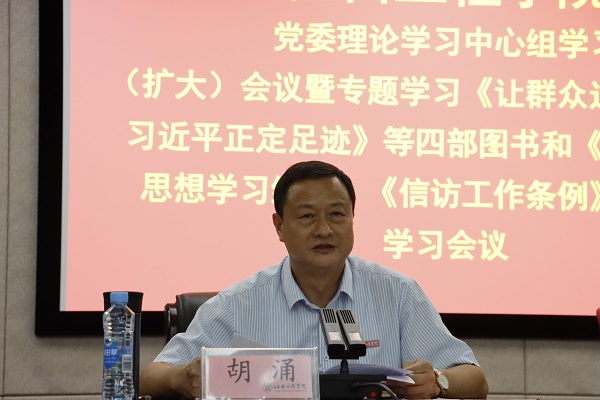 (本网讯 何凯 报道)9月28日下午,我校在行政楼三楼会议室召开2022年9月党委理论学习中心组学习(扩大)会暨专题学习《让群众过上好日子——习近平正定足迹》等四部图书和《习近平经济思想学习纲要》《信访工作条例》[最新版]学习会议。党委书记、督导专员胡涌主持会议并讲话,校领导张晨曙、冯赟、黄志良、刘德华、乐俊杰、陶小兵、邹建民出席会议,全校正处级以上干部参加会议。