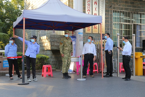 校园门口是所有出入的唯一通道。在一定程度上可以说,守好校门口的安全防线,就是守好校园疫情防控的防线。他们是当之无愧的“校园安全守护神”。“学校保卫处按照上级疫情防控要求,坚持入校师生员工“挂校徽、戴口罩、扫赣通行程码、查行程码、健康码、核酸检测结果报告、测体温正常”(简称:一测、一扫、三查看);外来人员除(一测、一扫、三查看),必须查验其身份证件,来校事由核实,校内联系人接送,方准入校园;禁止中、高疫情风险地区人员(包括禁止风险地区师生员工)入校园;组织专职巡逻人员、学生维稳分队,加强校园及周边24小时巡逻防控密度,禁止校园门前外卖、快餐、快递、小商、小贩等闲杂人员出现。”学校平安办副主任蒋方生告诉笔者。