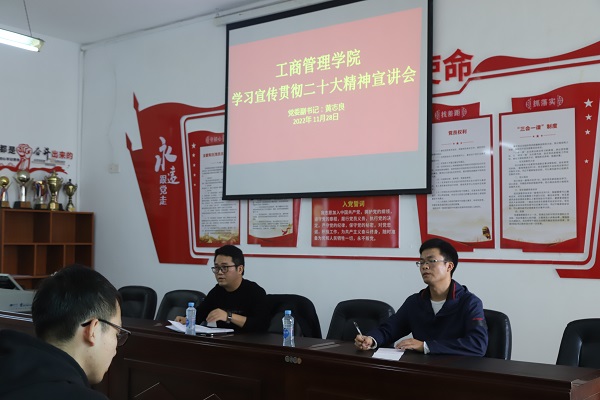 11月27日下午,校党委副书记、纪委书记黄志良为挂点单位宣讲党的二十大精神。宣讲会由工商管理学院负责同志主持。工商管理学院全体党员师生参加学习。