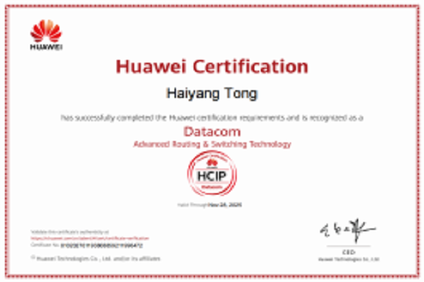 2022年11月29日,我校大数据与计算机学院18名同学参加了华为HCIP-Datacom认证考试且全部通过,通过率高达100%,最高分黄丽萍达到了884分,这18名同学成功获得华为HCIP-Datacom证书,是大数据与计算机学院着力对专业认证的要求,是培养高水平应用型人才的重要阶段性成果。