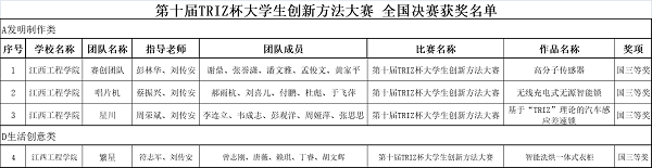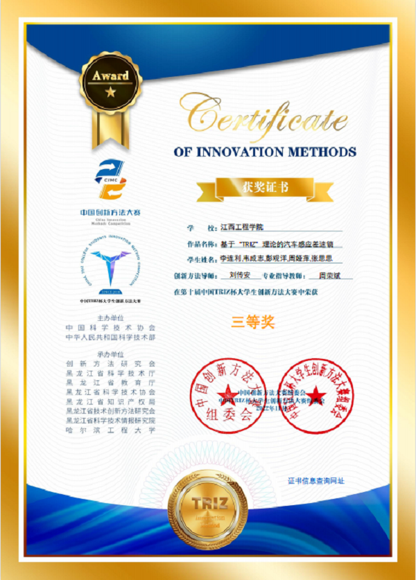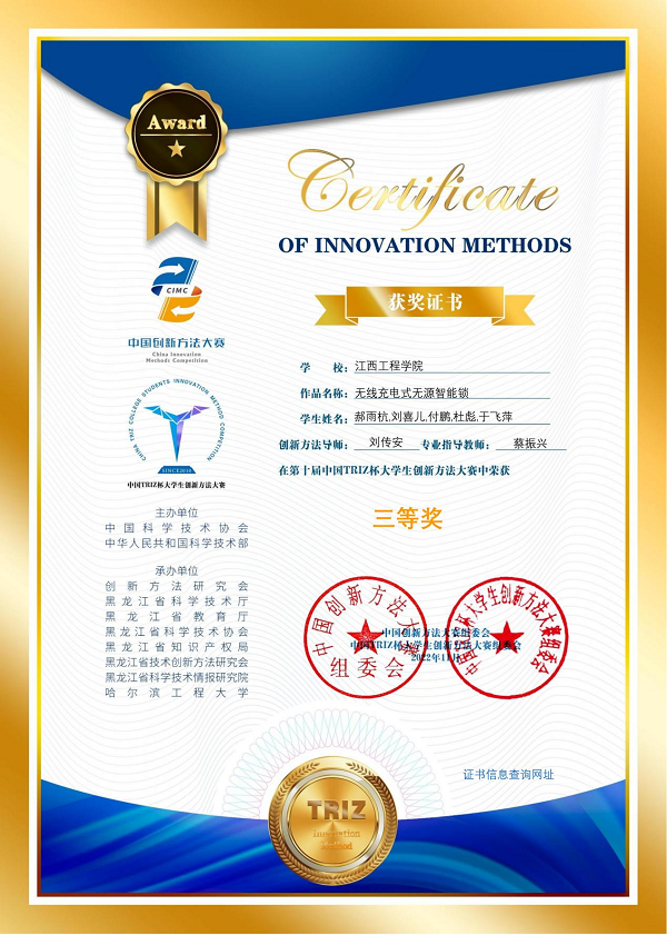 由郝雨杭同学带队申报的发明制作类项目“无线充电式无源智能锁”获得了国赛三等奖;由李连利同学带队申报的发明制作类的“基于“TRIZ”理论的汽车感应差速锁”获得了国赛三等奖;由谢鼎同学带队申报的发明制作类项目“高分子导电材料旋转脉冲计数传感器”获得了国赛三等奖;由曾志刚同学带队申报的生活创意类项目“智能洗烘一体式衣柜”获得了国赛三等奖。