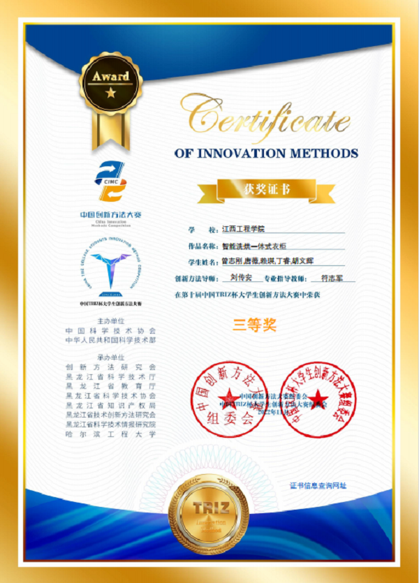 由智能制造与能源工程学院刘传安教授,符志军老师指导,由曾志刚同学带队申报的生活创意类项目“智能洗烘一体式衣柜”最终均获得了发明制作类国赛三等奖。