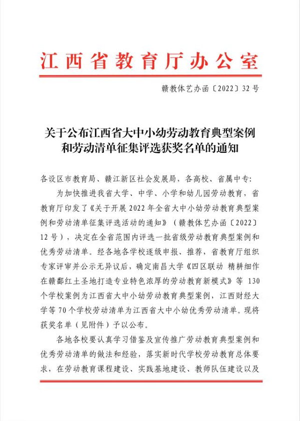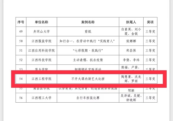 (本网讯 许江 报道)近日,为加快推进我省大学、中学、小学和幼儿园劳动教育,省教育厅决定在全省范围内评选一批省级劳动教育典型案例和优秀劳动清单。经过层层筛选,我校《不开火课内厨艺大比拼》劳动案例荣获三等奖。