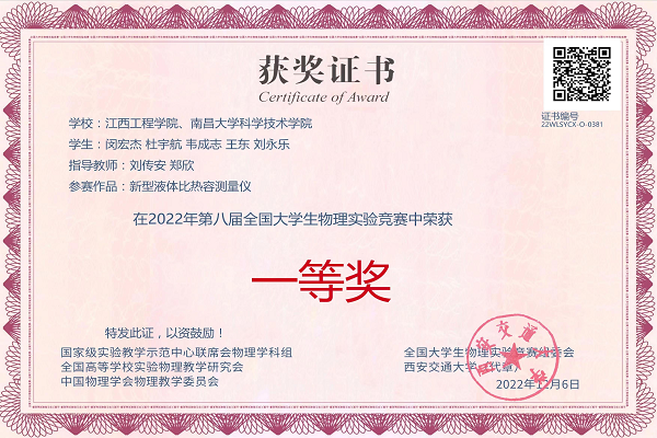 指导老师刘传安教授、郑欣老师带领的学生团队闵宏杰、杜宇航、韦成志、王东、刘永乐项目《新型液体比热容测量仪》自选课题类获一等奖。