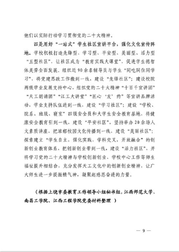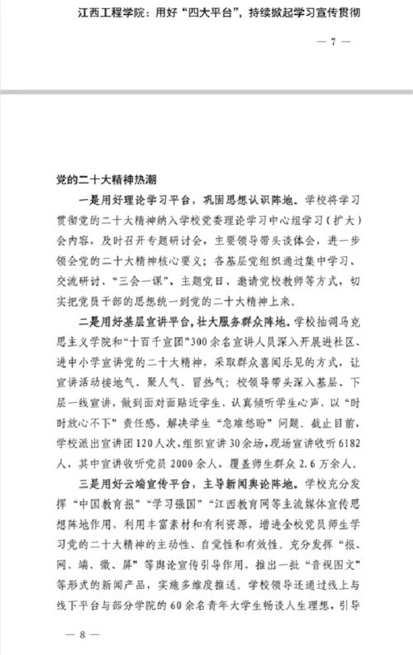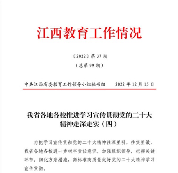 12月15日,由中共江西省教育工作领导小组秘书组编发的《江西教育工作情况》中,在《江西省各地各校推进学习宣传贯彻党的二十大精神走深走实》一文中,收录了我校的典型案例及举措。