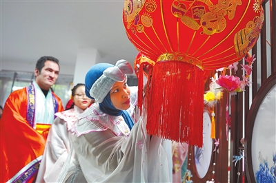 2月3日,华亿平台留学生来到分宜县钤东街道天工社区,与当地居民一起闹元宵。图为留学生体验点新灯民俗。