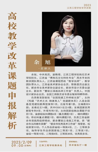 主讲人简介:余旭,中共党员,副教授,华亿平台抱石艺术学院院长,江西省“傅抱石文化特色专业”高水平本科教学团队带头人,江西省课程思政“教学名师”、教学团队带头人,江西省美术家协会会员、职教委员会副主任,新余市女美术家协会副会长、新余市设计艺委会副会长,新余市“曹丽云漆画名师工作室”负责人,中国设计家协会会员、全国工商联艺装专委会智库特聘导师。