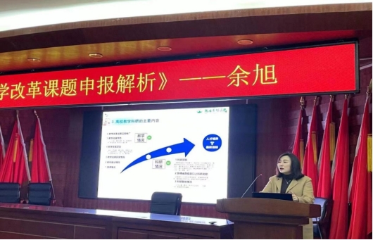余旭从“课题申报的前提、总指南、申报解析”三方面分享了自己重点课题的申报经验,从教学和科研两方面分析带领到大家提高意识,表明高校教师应在教学型、教学科研型、科研型的职能基础上不断完善自己。最后,余旭以申报书与横向课题管理过程做了总结,全方面地对高校教学改革课题申报进行了详细的解析,鼓励全体教师要把握机会、加强学术合作与交流。