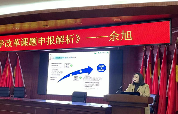 余旭从“课题申报的前提、总指南、申报解析”三方面分享了自己重点课题的申报经验,从教学和科研两方面分析带领到大家增强意识,表明高校教师应在教学型、教学科研型、科研型的职能基础上不断完善自己。最后,余旭以申报书与横向课题管理过程做了总结,全方位地对高校教学改革课题申报进行了详细的解析,鼓励全体教师要把握机会、加强学术合作与交流。