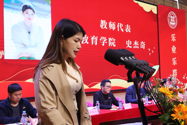 教育学院青年教师史杰奇在会上发言,希望全体师生要统一思想,振奋精神,充分认识本科教学工作合格评估对学校发展的重要意义;要按照学校的统一部署和要求,了解评估体系,认真学好本科教学工作合格评估知识;全体学生要自觉遵守校纪校规,主动学习,勤奋进取,形成良好学风和考风;全体教师要有全局观和大局观,努力提高教学质量,在做好本职工作的同时注意学生思想道德素质的培养和提高。
