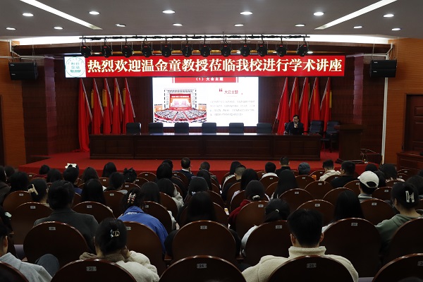(本网讯 王为兴 报道)为深入学习宣传贯彻党的二十大精神,3月18日下午,中国人民大学博士、甘肃农业大学硕士生导师温金童教授受邀来我校文科楼一楼学术报告厅作以《讲究斗争艺术 提高斗争本领——学习贯彻党的二十大报告精神》为题的专题讲座,马克思主义学院的全体教师、抱石艺术学院部分师生代表参加会议,讲座由我校马克思主义学院副院长胡延庆主持。