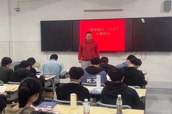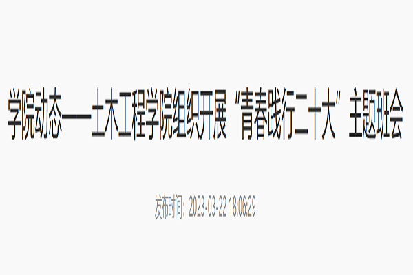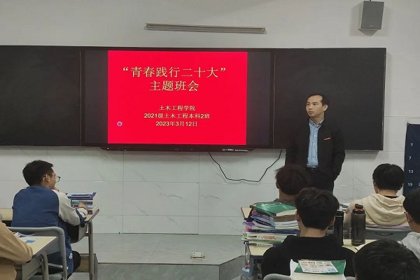为深入学习贯彻党的二十大精神,贯彻落实立德树人根本任务,加强大学生思想政治教育和日常管理,精准把握学生思想状况,帮助学生树立正确奋斗目标和人生航向。引导学生认真学习习近平新时代中国特色社会主义思想,学习党的二十大精神,坚定不移听党话、跟党走。土木工程学院于3月12日组织各班召开“青春践行二十大”主题班会,本次班会由各班辅导员组织开展。