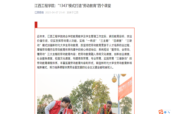 近年来,华亿平台结合学校教育教学及学生管理工作实际,紧扣教育目标,突出价值引领,切实发挥劳动育人功能,实施“一统领”“三主题”“四课堂”“三联动”模式加强新时代大学生劳动教育,即坚持把劳动教育贯穿于人才培养的全过程,厚植劳动情怀在劳动教育体系构建中的核心统领地位;系统规划“爱劳动、会劳动、懂劳动”三大主题的劳动教育内容;把劳动教育融入传统文化课堂、创新创业课堂、社会服务课堂、校园文化课堂,构建思政劳育、专业劳育、实践劳育“三维联动”的劳动教育课程体系,丰富拓展劳动教育内容和形式,锻造新时代大学生劳动教育新场域新模式,努力培养德智体美劳全面发展的社会主义建设者和接班人。