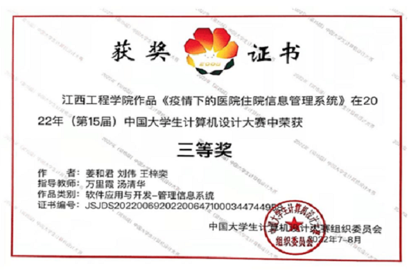 在2022(第15届)中国大学生计算机设计大赛中。由学校教师万里霞、汤清华指导,姜和君、刘伟、王梓奕三名学生所创作的参赛作品《疫情下的医院住院信息管理系统》荣获国家级三等奖,是学校参加此项比赛以来的最好成绩。中国大学生计算机设计大赛是我国高校面向本科生最早的赛事之一,由教育部高校与计算机相关的教指委等独立或联合主办,近年来跃入全国普通高校学科竞赛排行榜的榜单,是国内计算机设计领域最高水平赛事。