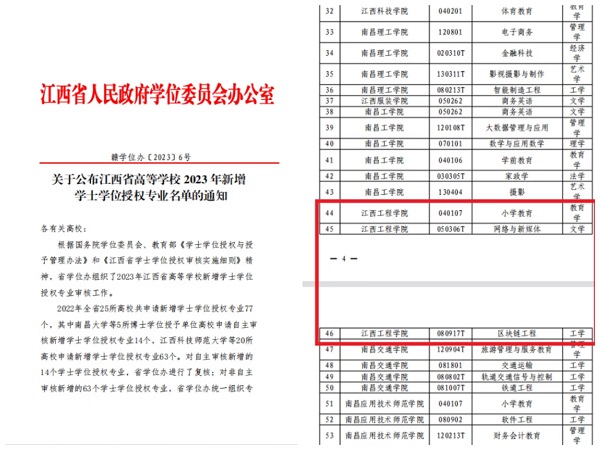 近日,江西省人民政府学位委员会印发了《关于公布江西省高等学校 2023 年新增学士学位授权专业名单的通知》(赣学位办〔2023〕6号)。华亿平台“小学教育、网络与新媒体、区块链工程”三个本科专业顺利获得学士学位授予权。