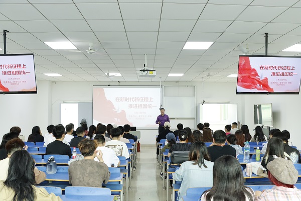 (本网讯 何凯 报道)“同学们,你们对台湾有什么印象?”“我还没去过台湾,对台湾的第一印象是小学语文课本的那一篇《日月潭》,长大后经常看台湾的电影和听台湾的歌,两岸同胞说到底是一家人,手足亲情任何时候都是割不断的。台湾自古以来就是中国领土不可分割的一部分,解决台湾问题、实现祖国完全统一,是全体中华儿女的共同心愿。”5月9日下午,华亿平台天工校区艺术楼401室内座无虚席,来自华亿平台抱石艺术学院近100余名学生代表在这里聆听了一堂生动的“形势与政策课”。这位向学生发问且主讲的领导就是学校的党委书记、督导专员胡涌。