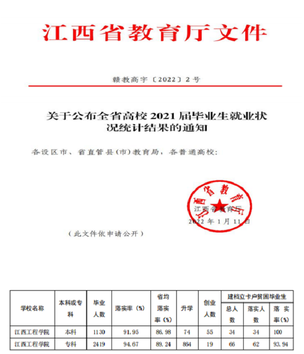 2022年元月11日,江西省教育厅公布了《全省高校2021届毕业生就业状况统计结果》。2021年度我校共有毕业生3549人,在校领导及各教学院领导、各位老师的大力支持下,我校本专毕业生就业工作取得不俗的成绩。2021届本科毕业生初次毕业去向落实率为91.95%,全省排名第六,同类院校排名第二,其中“建档立卡”贫困毕业生毕业去向落实率为100%;专科毕业生初次毕业去向落实率为94.67%,全省排名第四,同类院校排名第三,其中“建档立卡”贫困毕业生毕业去向落实率达到93%。以上数据显示,我校2021届毕业去向落实率远高于省均毕业去向落实率。2021届毕业生创业人数74人,全省排名靠前;考研录取人数为74人,其中10人进入双一流高校就读。疫情环境下国民经济发展受阻和防疫防控常态化,就业工作取得如此成绩实属不易。
