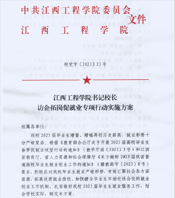 开展“访企拓岗”行动是学校全面深化校企合作,推进产教融合,构建校企协同育人机制,提高人才培养质量,促进毕业生高质量就业的现实需求,全体江工人立行立践学习贯彻习近平新时代中国特色社会主义思想主题教育,牢牢把握“学思想、强党性、重实践、建新功”的总要求,全力攻坚促就业,坚持学思用贯通、知信行统一,常态化开展访企拓岗专项活动,压实就业工作主体责任,用心用情助力2023届毕业生高质量充分就业,也为2024届毕业生秋招打下坚实基础。