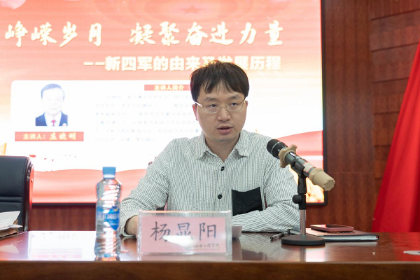 庄晓明以《回首峥嵘岁月 凝聚奋进力量—新四军的由来及发展历程》为主题,为我们带来了一场别开生面的专题讲座。他多角度、多方位向我们讲述了新四军浴血奋战的光辉历史。阐述了新四军将士们用鲜血和生命凝聚出的“听党指挥,忠于人民,坚贞不渝”铁军的信念;不怕牺牲,敢于胜利,百折不挠的铁的意志;军民一致,官兵一致,牢不可破的铁的团结;令行禁止,执纪严明,秋毫无犯的铁的纪律;勇猛顽强,英勇善战,所向无敌的铁的作风。新四军精神,闪耀着共产党人初心和使命的光芒。希望青年学生能够不忘初心使命,坚定理想信念,传承红色基因,赓续红色血脉。
