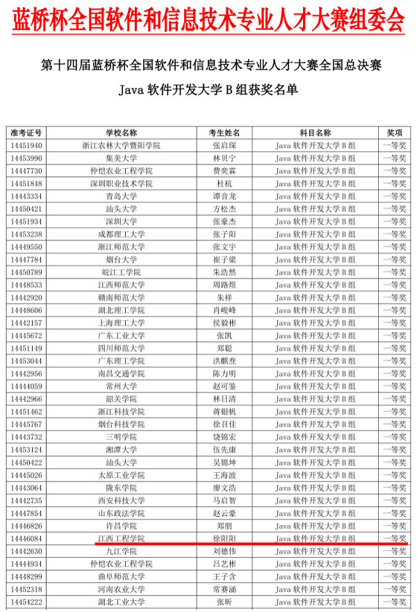第十四届蓝桥杯全国软件和信息技术专业人才大赛全国总决赛江西地区共设置了江西师范大学和南昌大学两个赛点。我校区块链学院三名学生成功从省赛中突围晋级,并在江西师范大学赛点参加了此次决赛,2020级软件工程本科4班徐阳阳同学获得Java软件开发大学B组一等奖,2021级区块链工程本科1班艾杰龙、汤旭两名同学获得C/C++程序设计大学B组优秀奖。