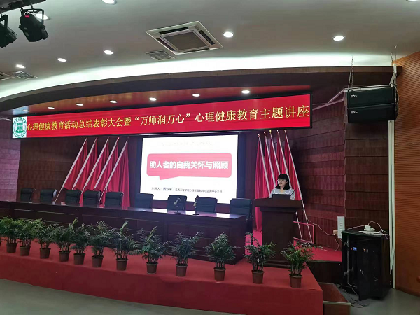 会议第二部分,由校心理健康教育与咨询中心主任晏双平做“助人者的自我关怀与照顾”心理健康教育主题讲座。