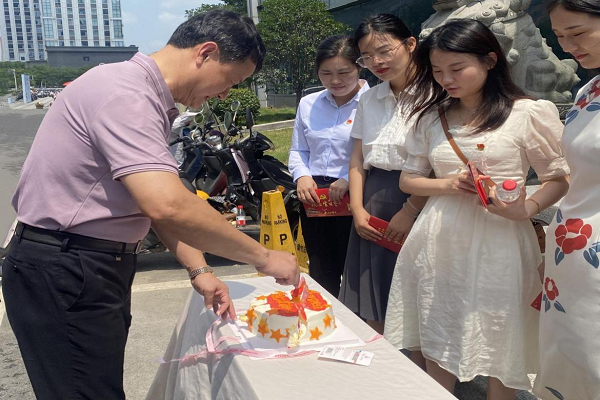 胡涌书记为党员同志切蛋糕,并勉励大家要时刻铭记党员身份,牢记党员使命,践行党员义务。