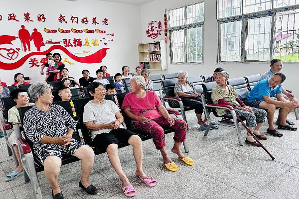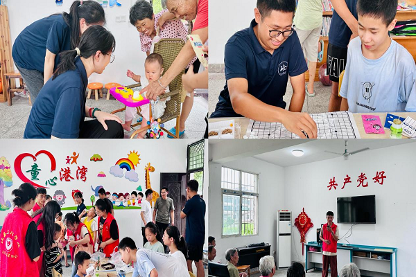 两校志愿服务队成员通过为老人按摩肩背、修剪指甲、清洗水果、唱歌、跳舞、拉家常、讲笑话、下象棋等方式,为小朋友分发见面小礼物,开展萝卜蹲、捉迷藏、下围棋等趣味小游戏为老人和孩子们送去了欢声和笑语。