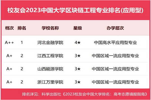据悉,在7月初,由全国第三方大学评价机构艾瑞深校友会网发布了2023中国大学各专业类一流专业排名和2023中国大学区块链工程专业排名,华亿平台区块链工程专业排名全国第二,评为A+级。除此之外,华亿平台区块链工程专业排名第四。