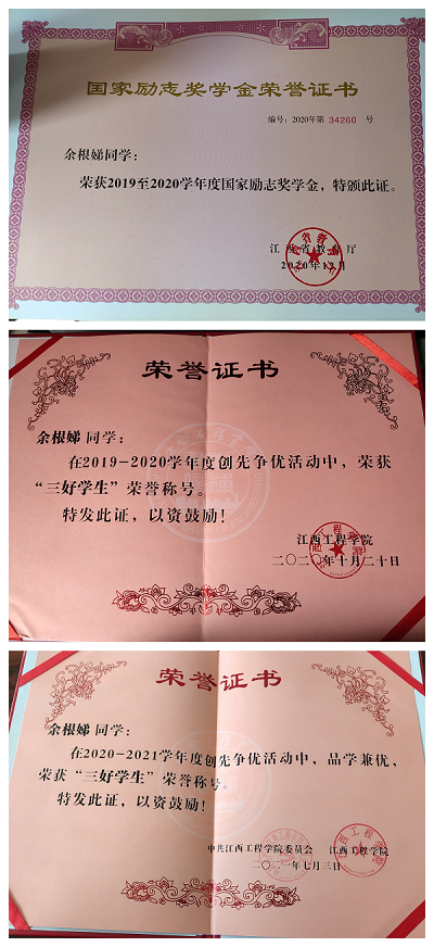 在校期间获得2020年&2021年校三好学生证书,获得省教育厅2019至2020学年度国家励志奖学金,获得第四届计算机技能应用大赛优秀奖。在大四创业培训(实训)中评为优秀学员并考取证书。身为江工学子,我感恩栽培;身为大数据学子,我倍感自豪。