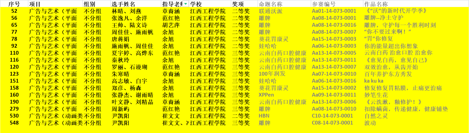 为进一步激发大学生科技创新活力,不断探索“以赛促建、以赛促教、以赛促学、赛学结合”的人才培养新模式,提升教育教学质量,江西省教育厅举办2023年江西省大学生科技创新竞赛(广告与艺术)。我校抱石艺术学院教师团队斩获7个二等奖10个三等奖!其中获奖老师有余旭、范红艳、胡艺萍、章裔涵、崔文文。