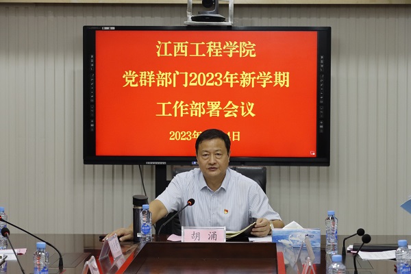 (本网讯 何凯 报道)为深入学习贯彻党的二十大精神和习近平总书记在中共中央政治局第五次集体学习时的重要讲话精神,9月14日下午,我校在行政楼七楼会议室召开党群部门2023年新学期工作部署会议,听取党群各部门工作汇报,安排部署今后一个时期工作,进一步交流经验、发现不足,明确方向、找准重点,推动党群工作提质增效,保障学校高质量发展。党委书记、督导专员胡涌主持会议并讲话,党委副书记、副校长冯赟,党委专职副书记、纪委书记刘先锋,党委委员、董事长助理、校长助理乐俊杰,党委委员、校长助理邹建民出席会议,党群各部门负责人参加会议。