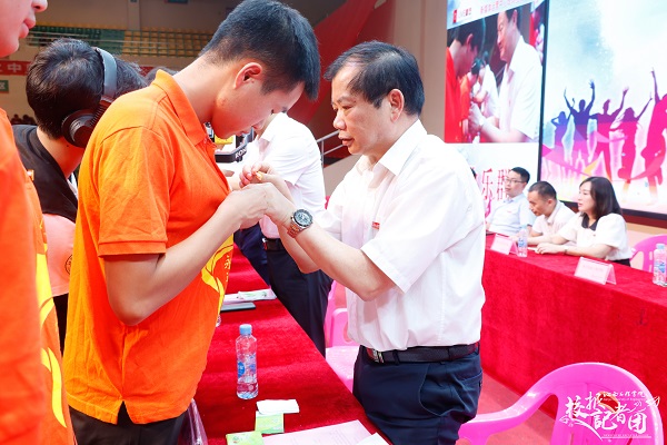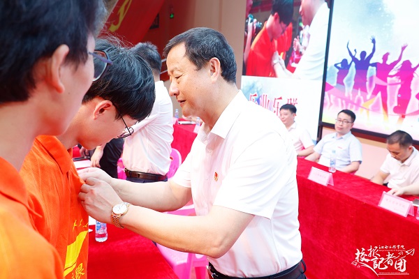 开学典礼上,校领导为新生代表佩戴校徽,象征从此拥有了“江工人”的身份。