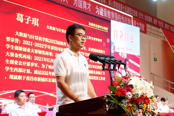 优秀毕业生代表、大数据与计算机学院2023届软件工程专业毕业生葛子琪通过自身经历给全体新生分享几点经验:一是学生自以学习为重,纳识则以谦逊最佳;二是敢想敢说,善做善为。三是积极参赛,参与活动,提升交际能力。