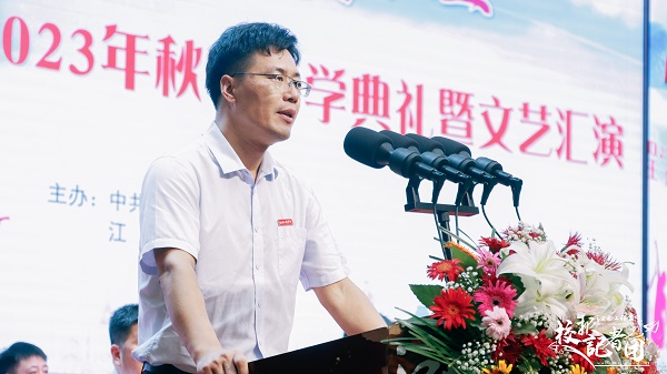 优秀在校生代表、智慧产业学院2021级软件工程1班许卫文代表江工学子,对2023级学弟学妹们的到来表示最热烈的欢迎和最真心的祝贺。他给同学们分享了学校校训“勤朴敏信”四个字。江工将是你们人生中崭新的起点,希望同学们在大学时期要充分做好知识、心理、能力、身体等方面的锻炼与储备。