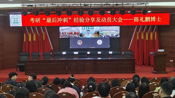 会议开始,陈礼鹏博士就国内考研的形势,考取研究生的意义做了充分的解读,特别强调对于大部分学生考研是一个自我提升的“捷径”,随后展示了其工作和学习的环境,瞬间点燃了在座学生热情。