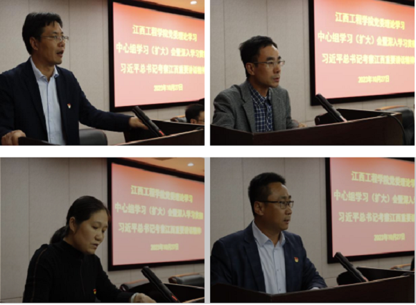 会上,党委副书记、副校长冯赟,党委委员、副校长刘德华,语言与传播学院党总支书记谢丽丽,教育与健康管理学院党总支书记刘永东,电子信息工程学院党总支书记陈小华围绕“深入学习贯彻习近平总书记考察江西重要讲话精神”为主题,结合本职工作实际作中心发言。大家纷纷表示,会认真学习贯彻习近平总书记考察江西重要讲话精神,深刻认识习近平总书记考察江西的重大意义,深刻领会习近平总书记对老区人民的深情大爱,全面理解习近平总书记对江西发展的战略定位,准确把握习近平总书记对江西工作的重要要求,切实把习近平总书记在江西考察时的重要讲话精神转化为推动学校改革发展的巨大动力、转化为担当实干的具体行动,坚定不移沿着习近平总书记指引的方向砥砺前行。